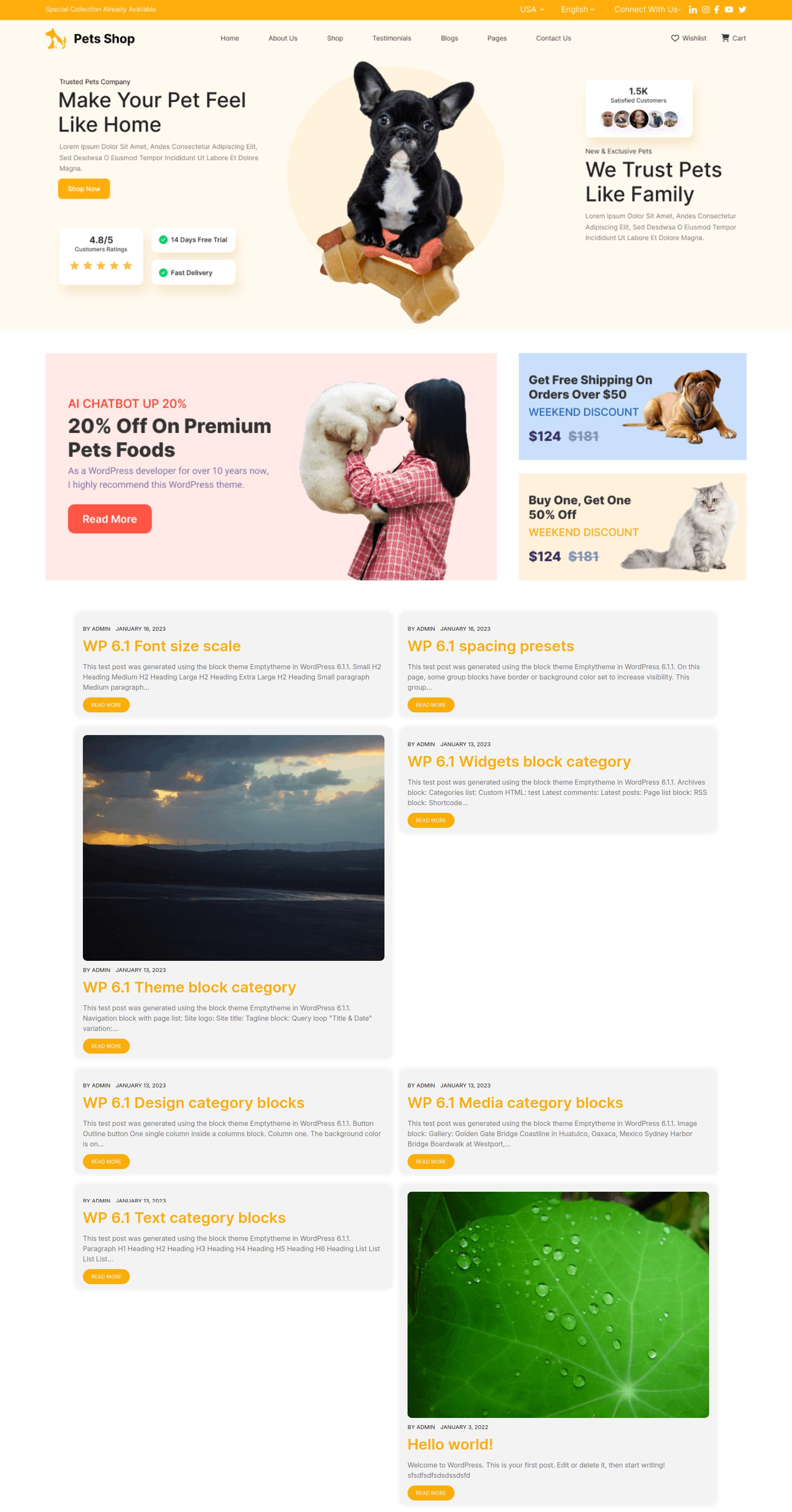 The Free Pet Food WordPress Theme is packed with essential features designed to enhance both usability and visual appeal. Its testimonial section lets happy customers share their experiences, building trust and credibility for your store. The About Us page provides the perfect space to highlight your mission and values, creating a personal connection with your audience. Customizable banners draw attention to pet shop discounts and pet product deals, ensuring your promotions get noticed. With translation readiness, your store can cater to global pet lovers, breaking language barriers effortlessly. The theme's SEO optimization boosts online visibility, while its clean, secure code ensures fast loading times and smooth performance. Showcase a range of offerings, from pet fashion accessories to pet grooming kits, or create a vibrant pet toy shop to engage your audience. This theme is a dynamic solution for transforming your online store into a thriving marketplace tailored to pet enthusiasts.