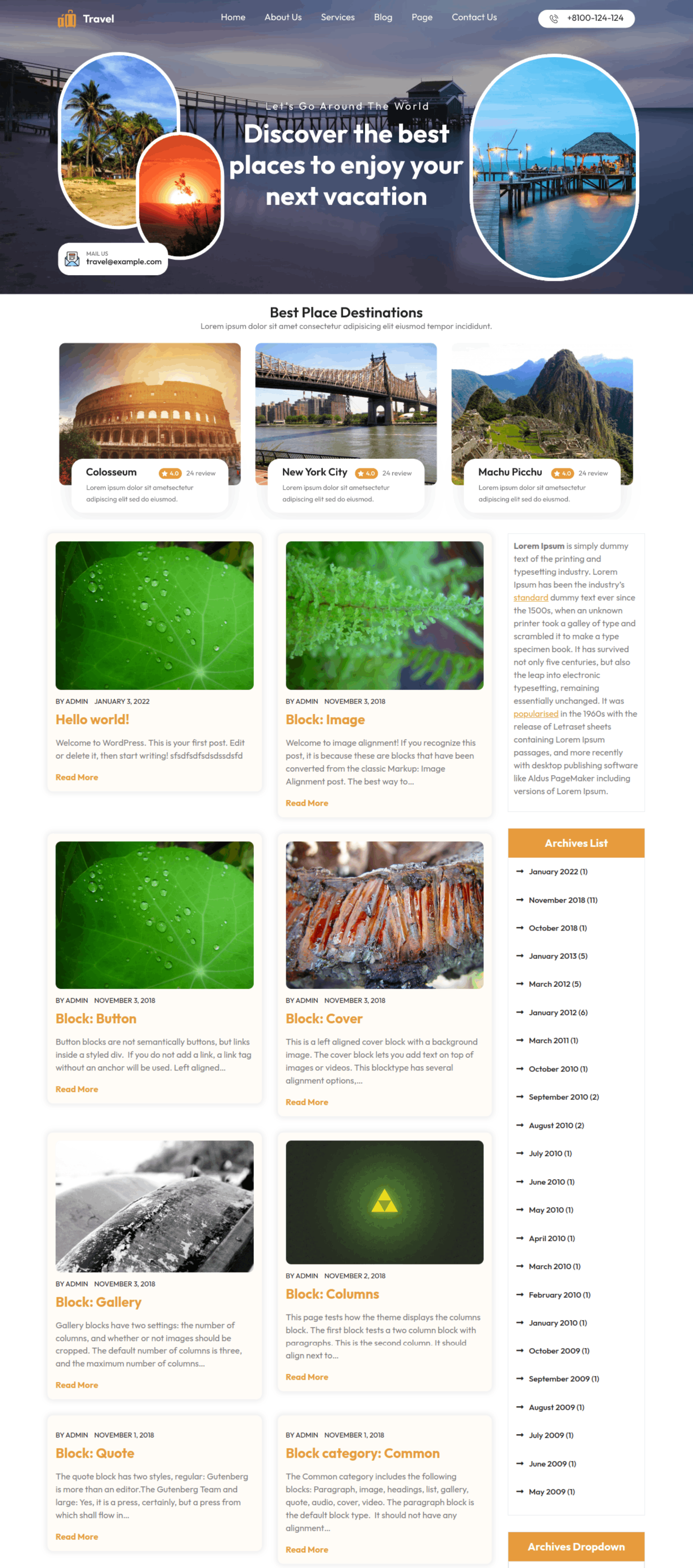 It will allow you to get the most out of all the included features. This theme can be used with many popular plugins, making it easy to add functionality to your website. The free traveller WordPress theme comes with a live theme customizer. This allows you to fine-tune your design elements and add your own flair to your site. You have a lot of shortcodes to help you add custom post types and widgets. It also includes all your contact information and a contact form that your potential clients can use to send you queries. It integrates with several payment gateways to enable secure and safe online payments. It is built to the latest WordPress standards and works on all platforms and web browsers. The free traveller WordPress theme includes every feature of Travel Tourism Proe you need for your website.
