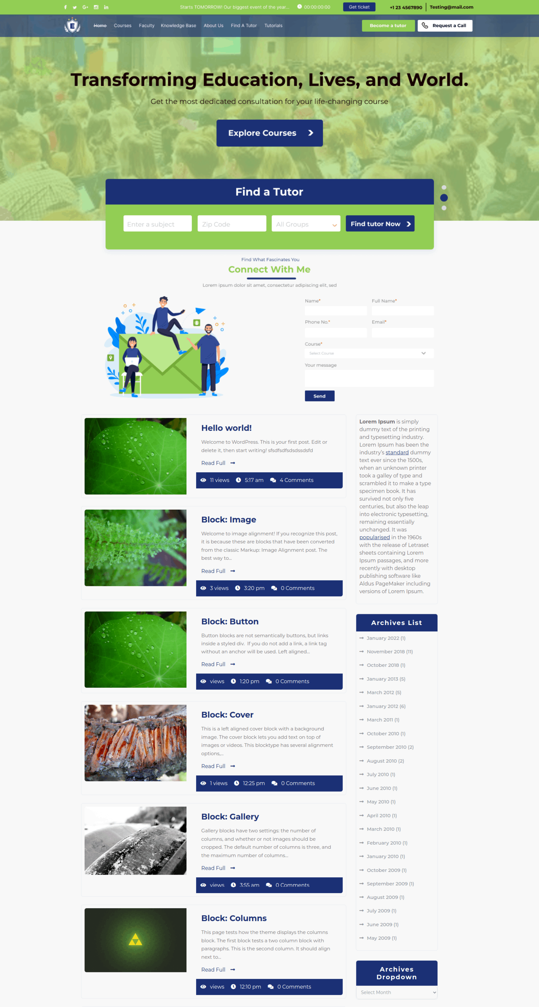 The Free Coaching WordPress Theme is a versatile and valuable tool designed for educators, tutors, coaching centers, and anyone involved in the field of education. It's meticulously created to cater to the specific needs of those looking to establish a professional and engaging online presence without incurring any costs. The primary advantage of choosing a free theme like this is accessibility. It allows educators, particularly those with budget constraints, to create a compelling online learning space without financial commitment. In terms of appearance, the Free Coaching WordPress Theme presents a clean and modern design that's both visually appealing and user-friendly. The layout and visual elements of this theme are thoughtfully selected to create an organized and engaging online environment, reflecting professionalism and trustworthiness. The theme caters to a diverse audience, including teachers, trainers, tutors, and coaching centers. It serves as a comprehensive platform to showcase courses, schedules, teaching expertise, and learning materials.