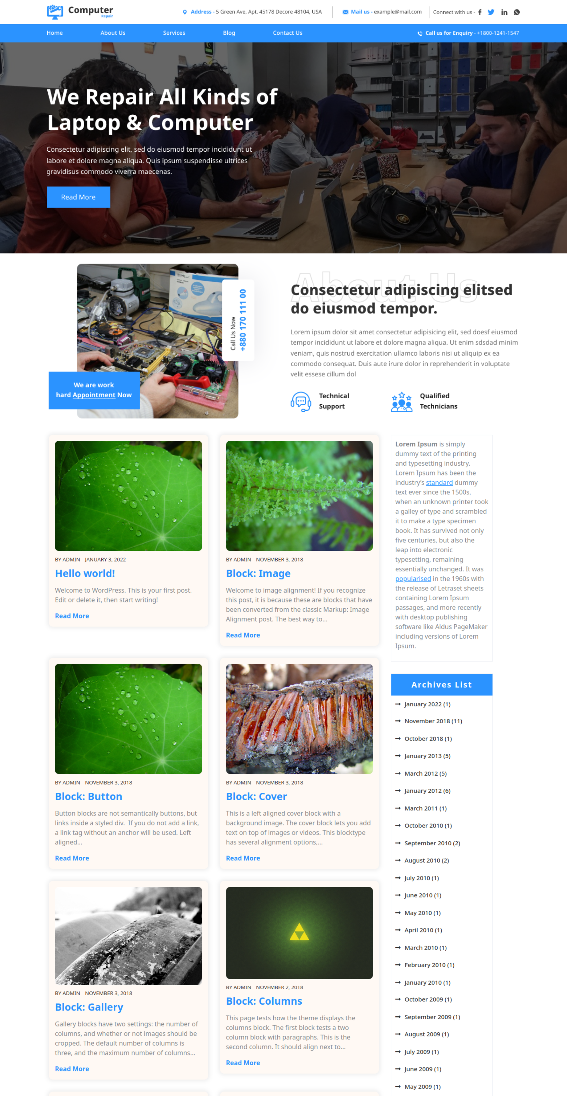 The theme has a lot of interesting features like social media icons, accessibility ready, compatibility with major plugins, Multiple Blog Layouts, grid layouts and much more. If you are looking for more premium sections than the two we are offering with our theme you can always opt for our premium theme. Free Computer Repair WordPress theme indeed has many styling options but if you are looking for more niche-specific sections than a premium theme is a very good option.