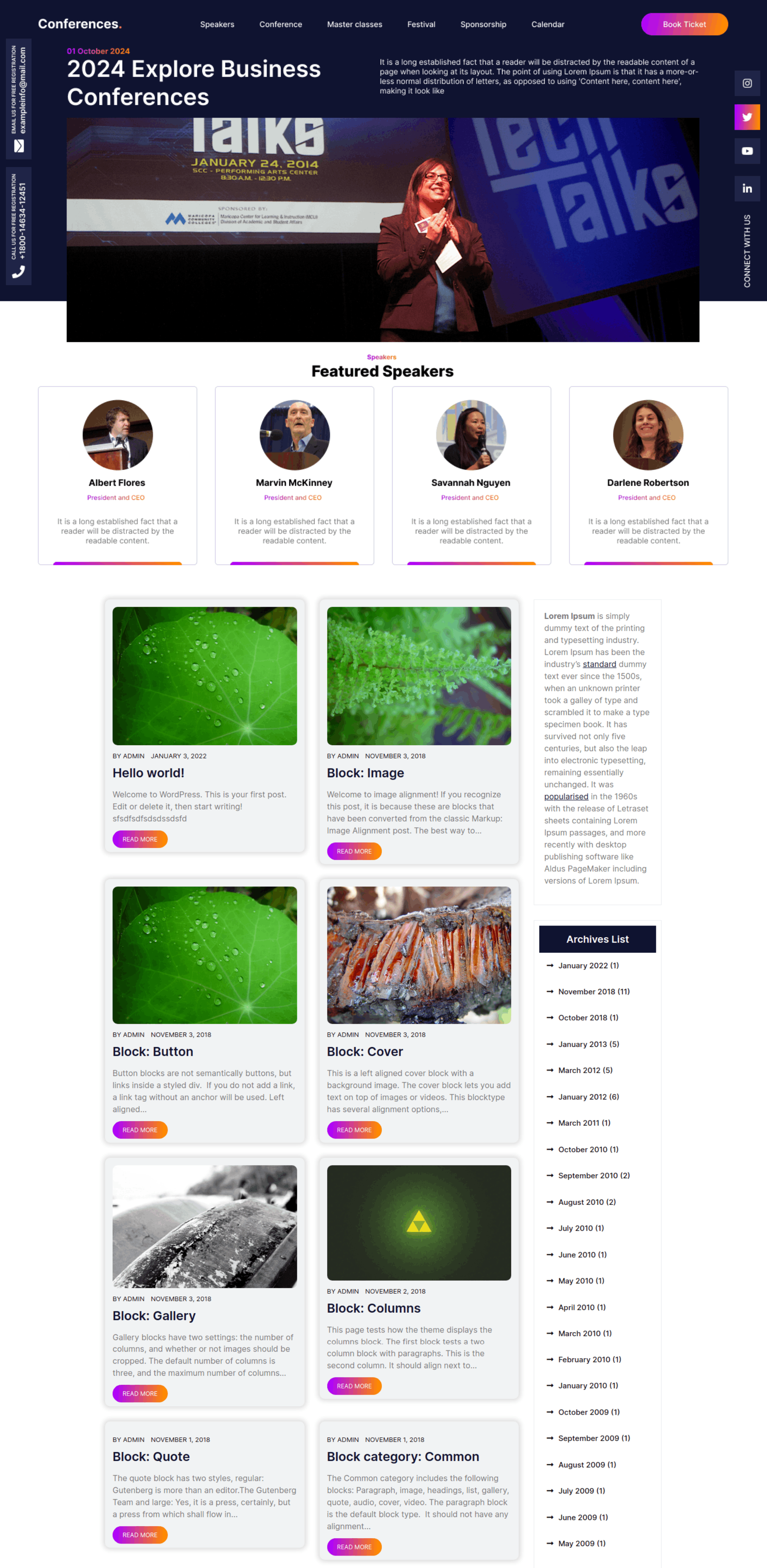 The Free Conference WordPress Theme serves as a versatile and cost-effective digital tool for a diverse array of users, including event organizers, businesses, and individuals seeking to host conferences without the financial burden. With a clean and modern design, the theme provides an accessible and visually appealing platform for showcasing conference details, engaging participants, and effectively managing events. Designed for simplicity and ease of use, the Free Conference WordPress Theme caters to a broad audience, from large-scale conference organizers to small businesses and community groups orchestrating local gatherings. Its professional aesthetics and user-friendly layout facilitate seamless navigation, ensuring visitors can effortlessly access crucial information such as event schedules, speaker profiles, session details, and registration options. One of the primary advantages of this theme lies in its cost-effectiveness. As a free solution, it empowers users to establish a polished online presence for their conferences without the financial constraints associated with premium themes.