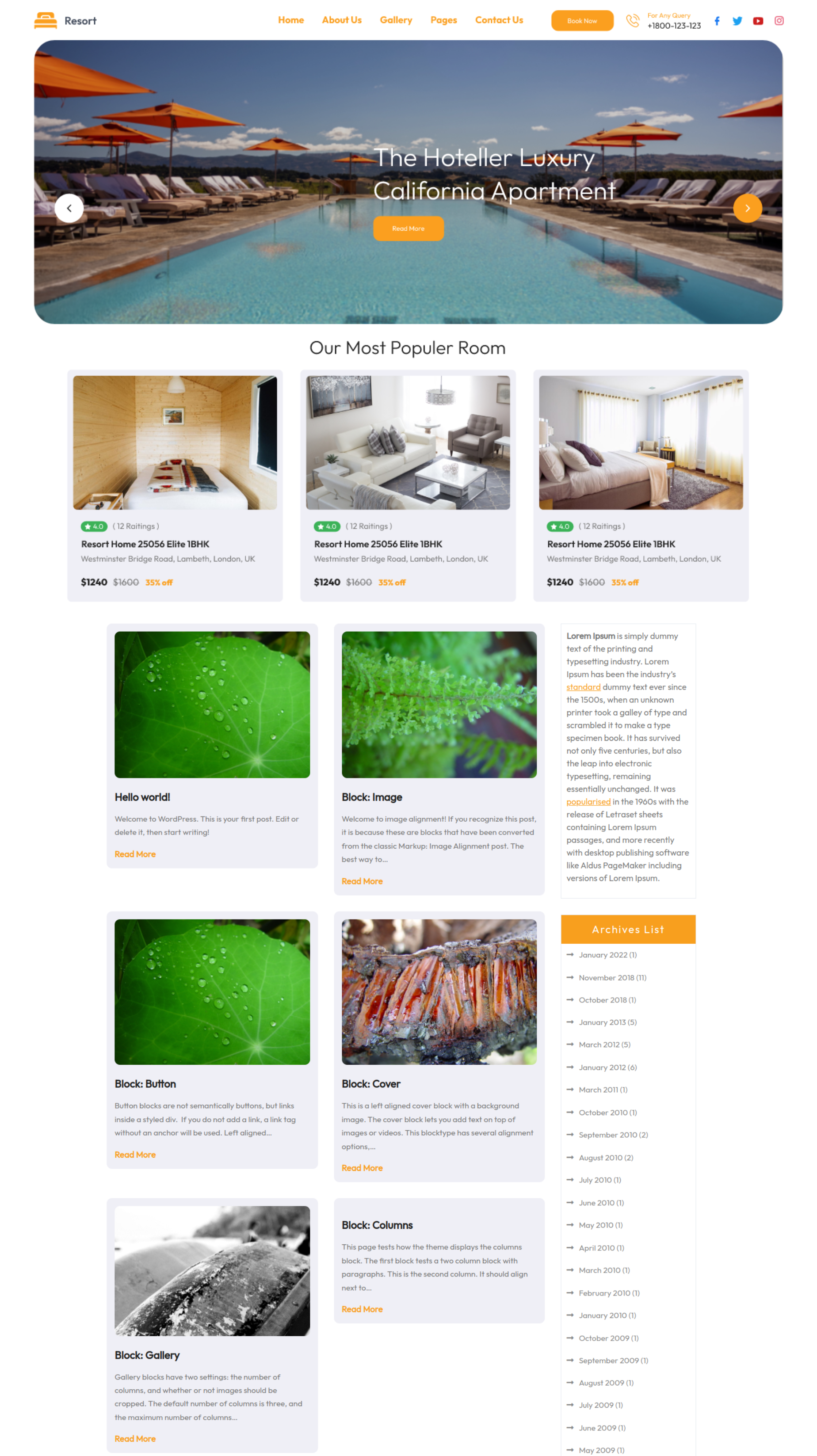 You will spot some outstanding coding done for the theme and its codes stick to the latest WordPress standards. If SEO is your main constraint then this theme will be the best solution since it comes with an SEO-optimzed design that takes care of the traffic coming to your website. Call to Action (CTA) will take care to convert your visitors into valued clients. With the various social media icons included in the Free Hotel WordPress Theme, you can embed your various sial media profiles or accounts onto your website for showcasing the pictures of your hotels and accommodation services. For having a global appeal, this theme includes WPML and RTL compatibility that makes your content available in various languages. Cross-browser compatibility is yet another great feature of this theme. Free Hotel WordPress Theme also has plugin compatibility that makes it easy for you to add more functionality to your existing website.